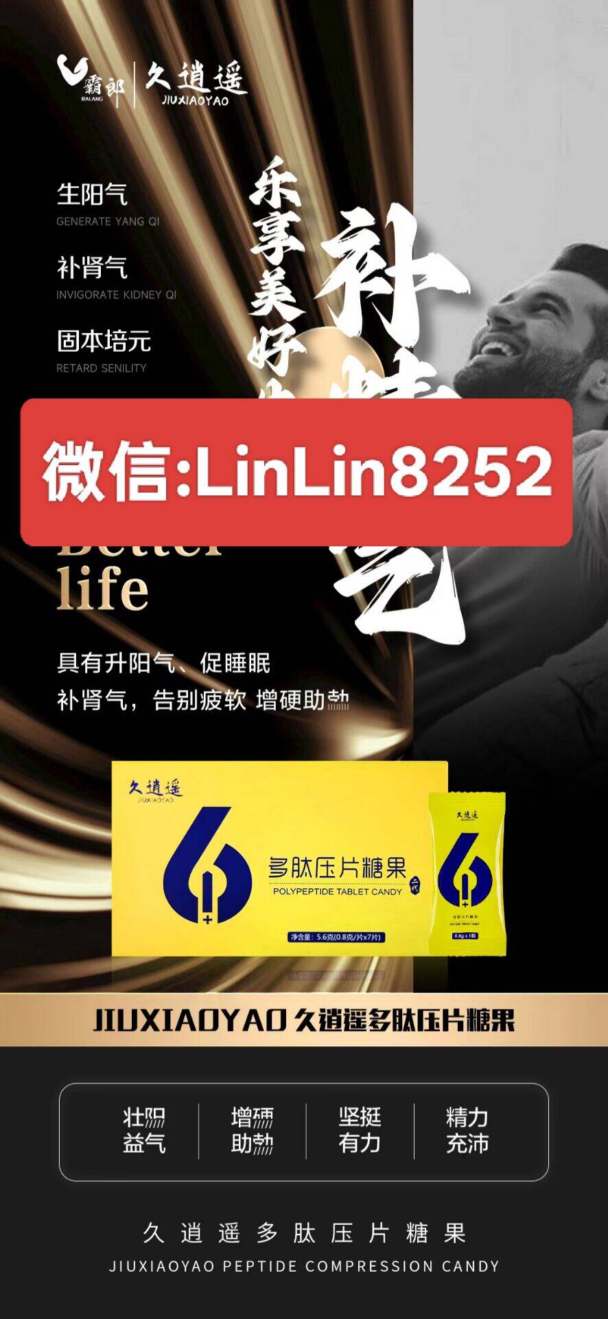 【久逍遙多肽壓片糖果】適宜人群:易疲勞者、陽wei、早xie、腎xu、JJ潮濕、JJ短小、X功能減退、bo起不堅、腰膝酸軟、頭暈、耳鳴、失眠多夢、多汗、無力、記憶力減退、未老先衰、須發(fā)早白、以及腎xu引起的尿頻、尿急、尿等待、前列腺炎、前列腺增生肥大等男XX功能障礙等放心服用。為什么有些人年紀(jì)輕輕卻經(jīng)常腰酸背痛?事后腿軟?男性腰疼主要是腎虛在神經(jīng)肌肉方面的表現(xiàn),時常伴有失眠、頭暈?zāi)X脹、腰酸背痛、下肢乏力,經(jīng)常感到困乏、多夢、易驚醒等。男人腰痛,這說明了腎和前列腺出了問題!需要補腎了哦!男性如果能夠堅持服用【久逍遙多肽壓片糖果】就會發(fā)現(xiàn)整個人的睡眠、氣色、精力都會全部改善,中途疲軟堅持一周期整體改善!而從營養(yǎng)學(xué)角度分析:【久逍遙多肽壓片糖果】中的牡蠣,瑪咖,肉桂,人參,蛹蟲草,黃精,枸杞子,桑葚具有:抗疲勞,增強免疫力,改善內(nèi)分泌,補腎,改善X功能等功效!